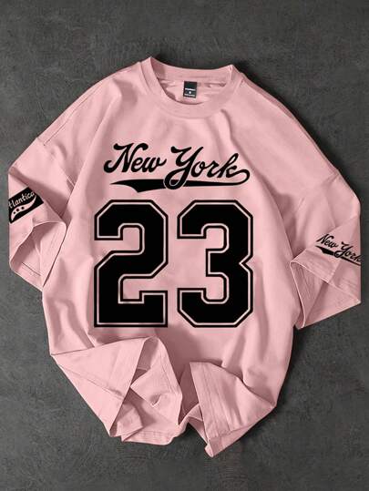 PAVTROS 男士字母印花圆领休闲修身短袖 T 恤,2000 年代风格 - 粉色 - 查看 1