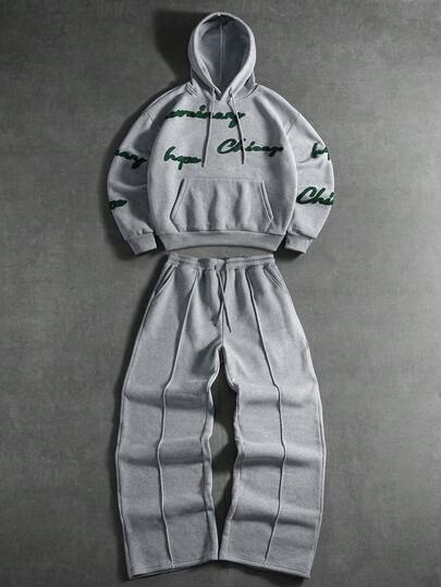PAVTROS 男士字母植绒连帽衫和运动裤套装,冬季 - 灰色 - 查看 9