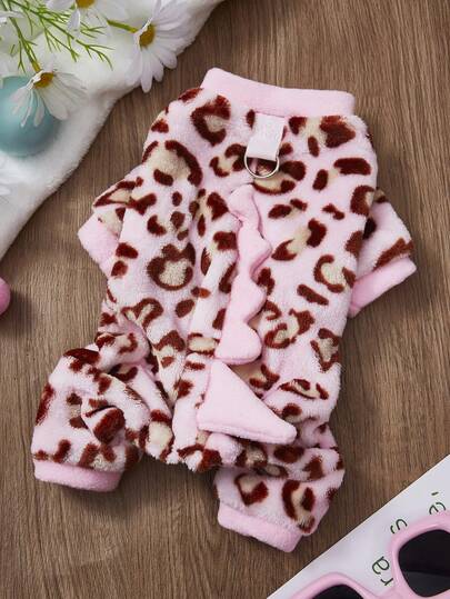 PETSIN 1件粉色豹纹恐龙带牵引扣宠物连体衣秋冬法兰绒加厚保暖四足衣服 - 粉色 - 查看 1