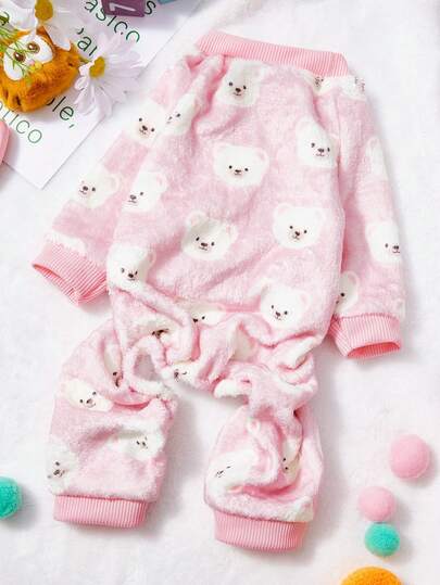 PETSIN 1件米色泰迪熊头印花宠物连体衣,粉色秋冬法兰绒保暖舒适宠物保暖服 - 彩色 - 查看 1