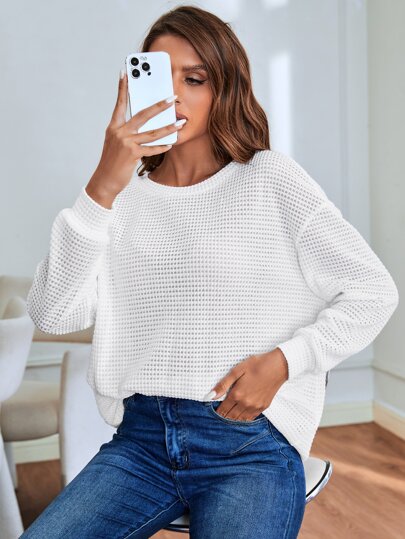 SHEIN LUNE 素色落肩袖運動衫 - 白色 - 查看 1