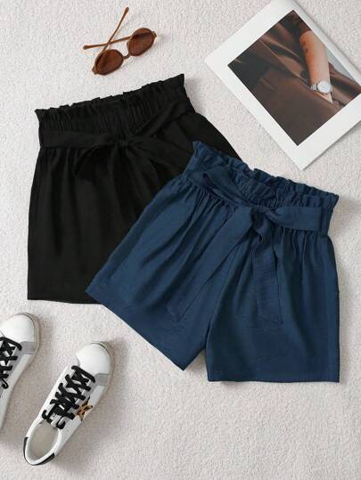 Chiquease 2 件纯色高腰纸袋抽绳休闲短裤,适合通勤和度假 - 藏蓝色 - 查看 2