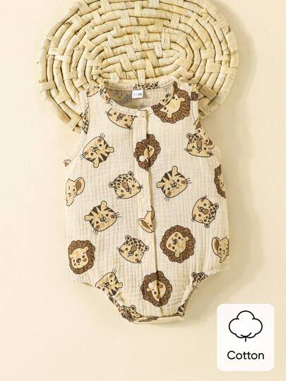 SHEIN 新生儿夏季新款婴儿宝宝纯棉可爱狮子卡通印花连体衣婴儿衣服套装 - 卡其色 - 查看 1