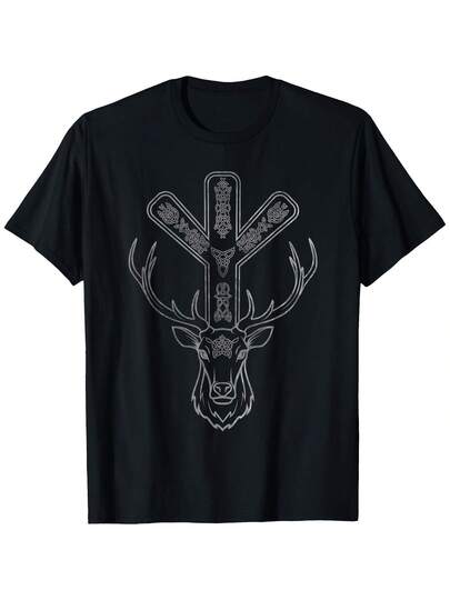 Algiz Rune And Deer T-Shirt - Men's Black Cotton 65% Polyester 35% Modern Letter Print Short Sleeve Crew Neck Small - 黑色 - 查看 1