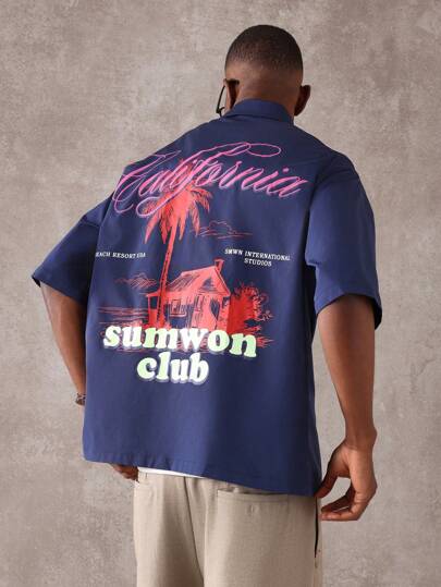 SUMWON 加州海滩度假村图案印花短袖衬衫休闲夏季纽扣领海滩俱乐部度假装宽松版型 - 藍色 - 查看 2