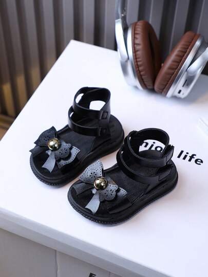 新款罗马风格夏季休闲女童时尚儿童防滑平底宝宝凉鞋 - 黑色 - 查看 1