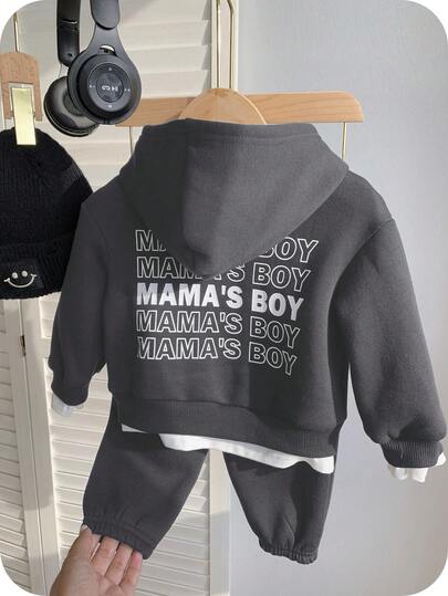 SHEIN Leap Crew 2 件套男婴套装:宽松字母印花套头连帽衫 + 宽松休闲裤,百搭简约设计,适合学校、居家、外出。保暖内衬,加厚,适合秋冬季 - 深灰色 - 查看 1