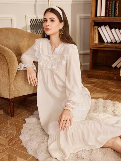 PalaceNights 刺绣荷叶边V领长袖宽松女士睡裙 - 米色 - 查看 1
