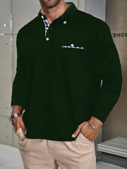 Manfinity Mode 大码男士休闲格子拼布 Polo 衫,秋季 - 墨綠色 - 查看 1