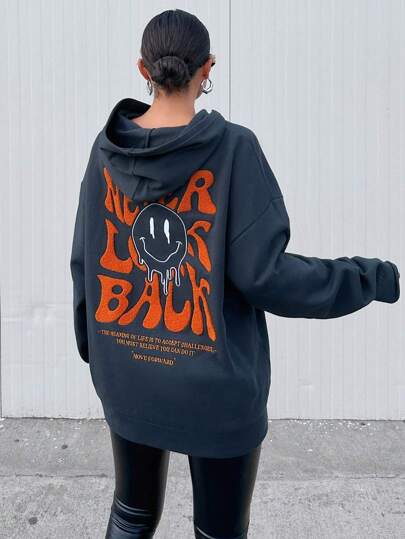 EURMUSE 女式標語與卡通印花連帽衫 - 灰色 - 查看 1