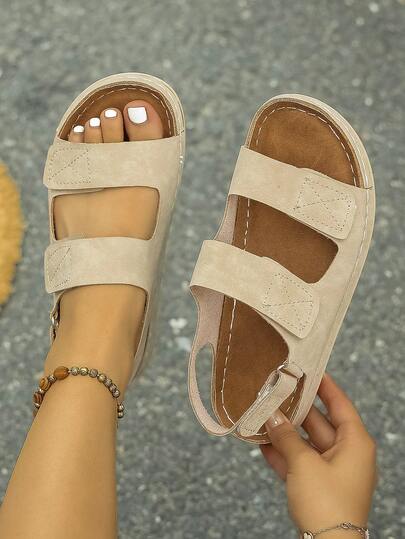 IH2 女士夏季新款纯色边缘钩环手工编织平底凉鞋,百搭休闲度假舒适运动凉鞋 - 杏色 - 查看 1