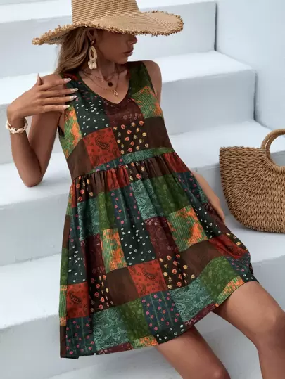 SHEIN VCAY 撞色拼接圖案娃娃裙 - 彩色 - 查看 1