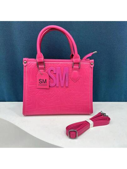 Personalized Embossed Letter Women's Handbag, Large-Capacity Shoulder Bag, European And American Fashion Retro Square Cross-Body Bag - 玫紅色 - 查看 1