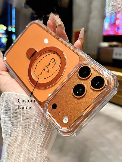 个性化奢华定制姓名透明磁吸旋转支架手机壳,兼容 17 Pro Max、17 Pro、17 Pro、17、16、15、14、13、12、11 Pro Max,防震保护后盖 - 橘色 - 查看 1