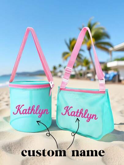 个性化网状沙滩包套装 - 定制名字贝壳包,适合儿童,桶装和单肩夏季泳池手提包组合 - 彩色 - 查看 1
