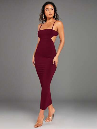 Silquee 女士优雅性感纯色露背修身吊带裙 - 酒紅色 - 查看 1
