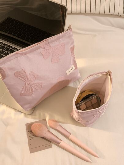 粉色蝴蝶结压花印花化妆包,大容量拉链化妆包,多功能收纳包,卫生包,卫生包,零钱包,粉色方形化妆包大容量化妆包大容量旅行 - 彩色 - 查看 10