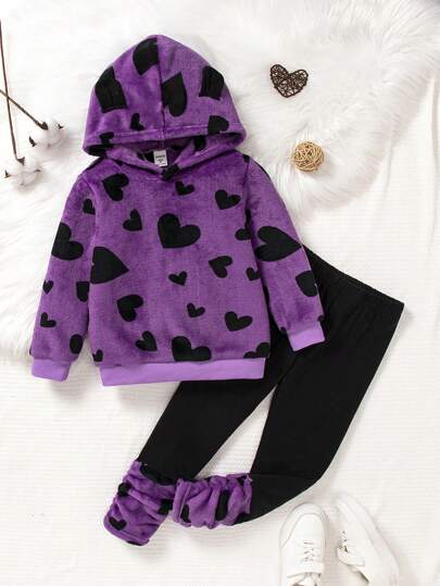 SHEIN 少女心印花泰迪連帽衫和褶皺長褲 - 紫色 - 查看 1