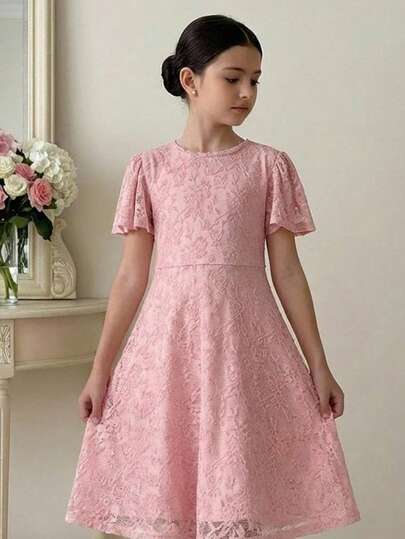 Pitira 少女粉色荷叶袖圆领修身连衣裙,优雅迷人,适合派对、婚礼季、节日、情人节、花童/伴娘礼服。 - 粉色 - 查看 1