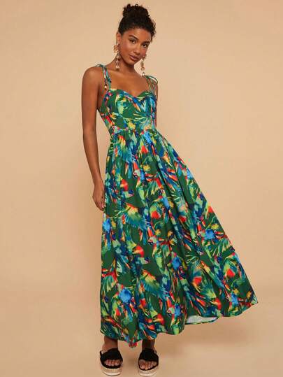 Travachic 春夏海边休闲度假,肩带蝴蝶结配木珠装饰,罩杯结构,收腰宽松连衣裙,女士绿色热带印花超长吊带裙(背部有弹性,可搭配任何身材) - 綠色 - 查看 1