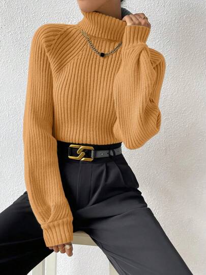 Chiquease 纯色高领罗纹针织休闲套头毛衣,长袖 - 棕色 - 查看 1