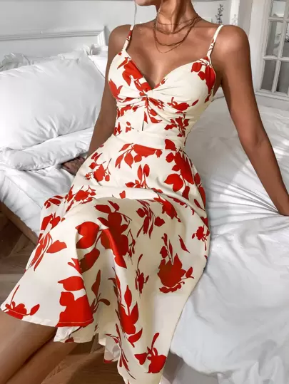 GENKIRA 植物圖案後綁帶吊帶連衣裙