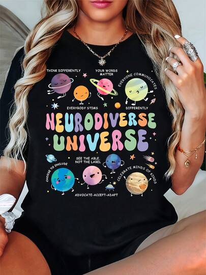 Plus Size T-Shirt, Neurodiverse Universe Print, Fun Planets, Teacher T-Shirt, Large Sizes