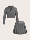 Sweetra 加大码纯色西装领,松紧后背,二合一百褶裙套装,春秋季