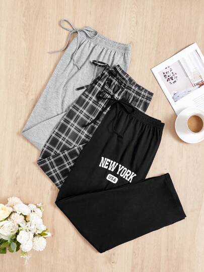 大碼3入組格紋&字母圖案腰部打結睡褲 - 彩色 - 查看 1