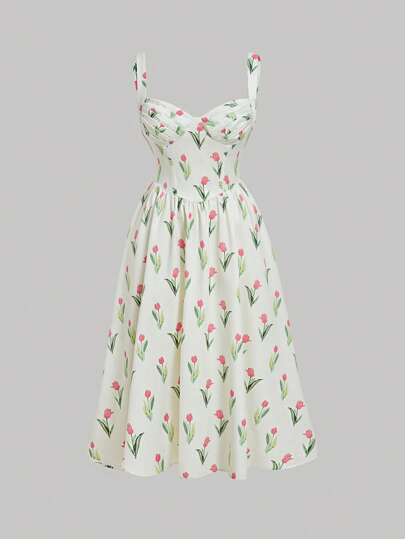 SHEIN MOD 大碼滿版印花吊帶連衣裙 - 米色 - 查看 1