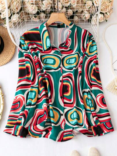 SHEIN Clasi 大碼全身印花正面鈕扣襯衫 - 彩色 - 查看 1
