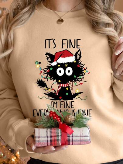 INAWLY 圣诞印花保暖内衬卫衣,冬季套头衫,秋季卫衣 - 卡其色 - 查看 2