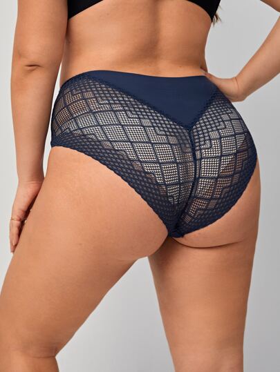 加大號對比蕾絲底褲內衣 - 藏蓝色 - 查看 1
