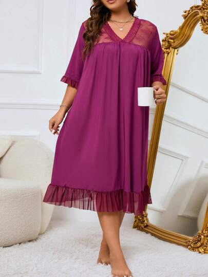 加大对比色蕾丝荷叶边下摆睡衣睡裙 - 紫色 - 查看 1