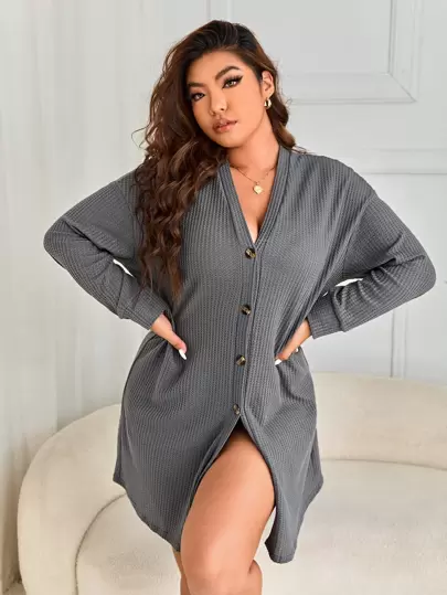 大碼落肩袖華夫格編織睡袍 - 灰色 - 查看 1