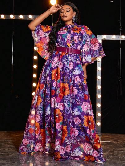 大碼印花蝴蝶袖連衣裙 - 紫色 - 查看 1