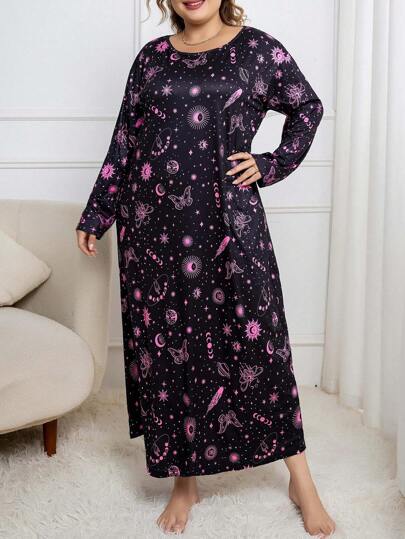 Plus 星空印花睡衣连衣裙,长款,宽松舒适,细节优雅,适合秋冬季节穿着 - 彩色 - 查看 1