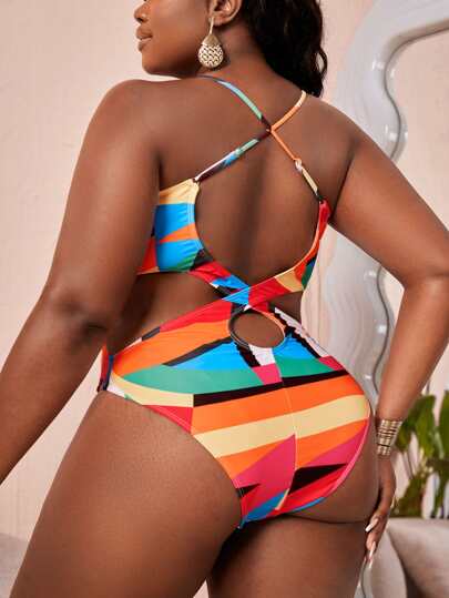 大碼幾何印花露背交叉連體泳衣 - 彩色 - 查看 1