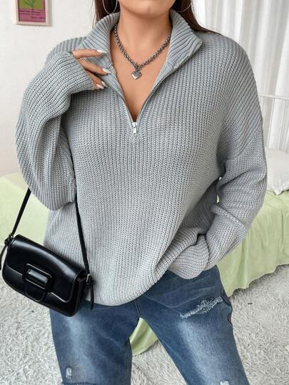 Flirla 加大码半拉链落肩针织套头衫秋冬毛衣 - 灰色 - 查看 1