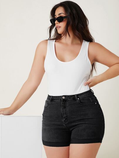 SHEIN Frenchy 大碼高腰破洞牛仔短褲 - 黑色 - 查看 1
