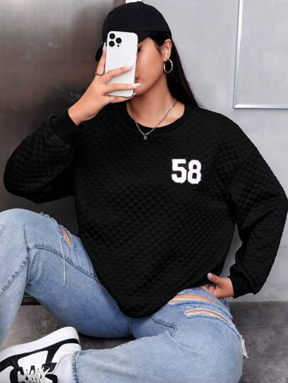 SHEIN EZwear 大碼字母圖案落肩袖運動衫 - 黑色 - 查看 1