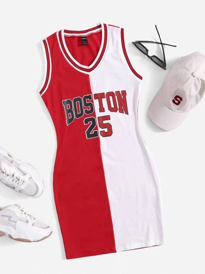 SHEIN Coolane 大碼字母圖案雙色背心連衣裙 - 紅白色 - 查看 1