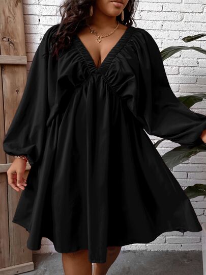 SHEIN LUNE 大碼深V領燈籠袖連衣裙 - 黑色 - 查看 1