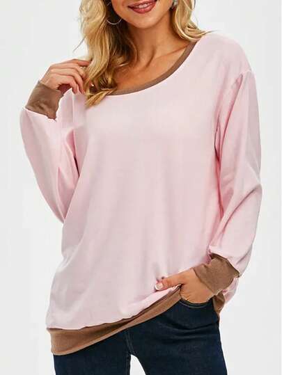 加大碼彈力鬆身運動衫上衣配以鬆緊邊緣 - 粉色 - 查看 1