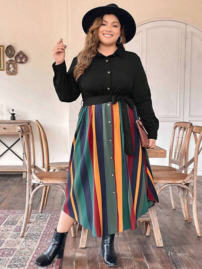 大尺碼腰帶連衣裙,印花拼接,衬衫领和纽扣设计