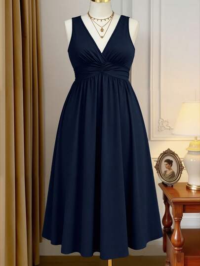 EMERY ROSE 大码黑色 V 领腰部褶皱针织连衣裙 - 藏蓝色 - 查看 1