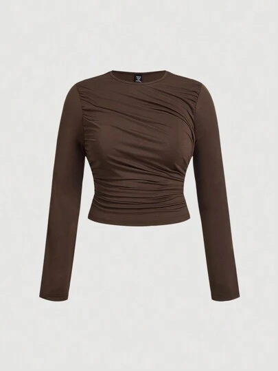 SHEIN MOD 大码棕色褶皱休闲长袖 T 恤上衣 - 灰色 - 查看 1