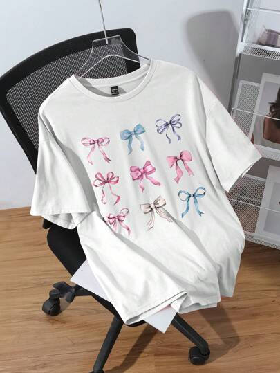 SHEIN EZwear 大码蝴蝶结印花休闲短袖圆领宽松 T 恤 - 白色 - 查看 1