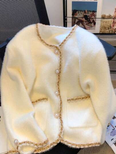 女士加大码开衫、女士长袖圆领秋装、双口袋前扣毛衣、纯色宽松短款优雅针织上衣、秋冬万圣节圣诞服装 - 白色 - 查看 1