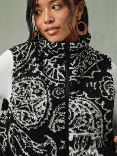Freevana 大码休闲拼色印花无袖夹克,秋冬 - 彩色 - 查看 1